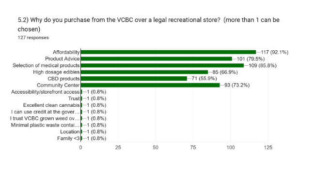 When asked why our members purchase at the VCBC, 100% of respondents indicated that affordability and selection of medical products were significant factors in the decision. Most of the members (78%) consider the product advice another reason why they choose us over the legal medical program. Storefront access was another important rationale for preferring the VCBC, with 82% acknowledging that was imperative, and the fact that the VCBC acts as a community center was vital to 73% of the members that responded.